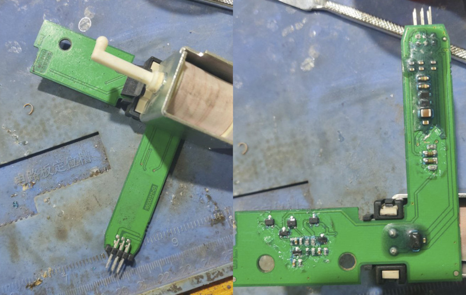 Варварски разбираем ручку и ищем плату с концевиками. Плату нашли, концевиков нет. Греем плату, ковыряем заливку — те же транзисторы. По идее, всё должно работать.